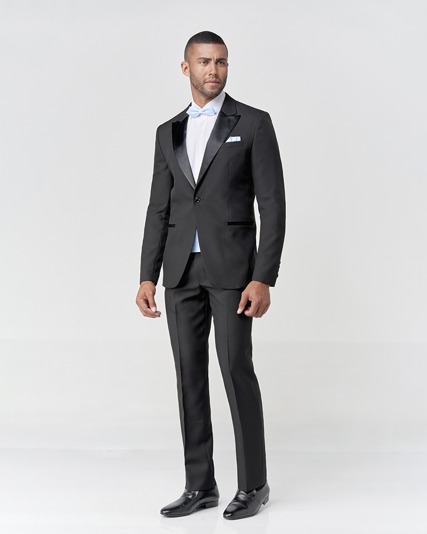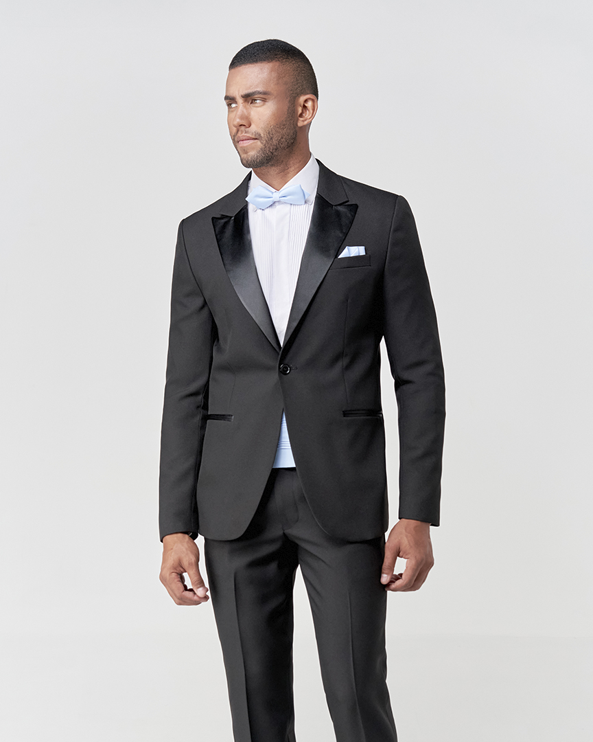 Smoking com abotoamento único, lapela de bico alongada em cetim e sem abertura traseira.