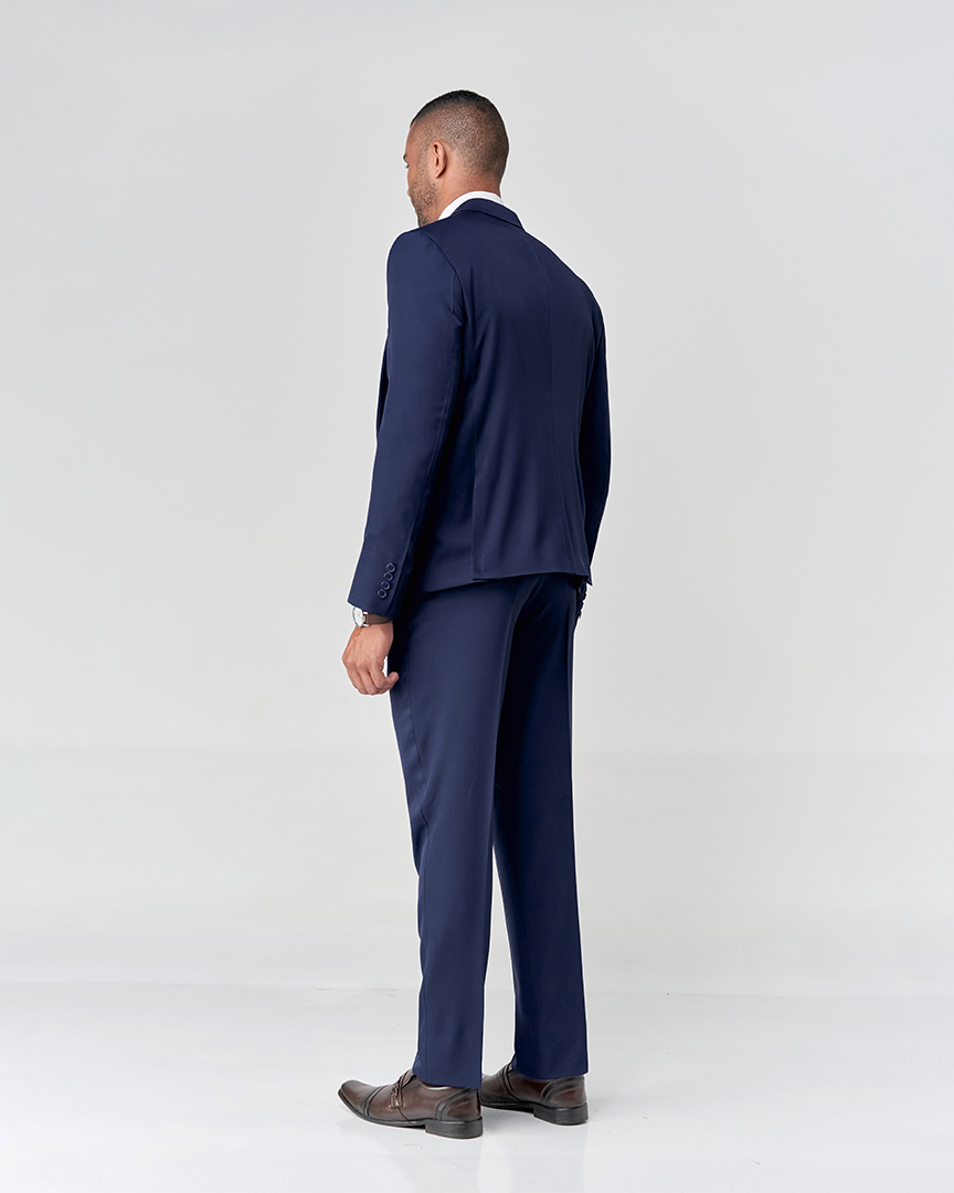 Terno Slim Fit com dois botões, lapela notch e duas aberturas traseiras.