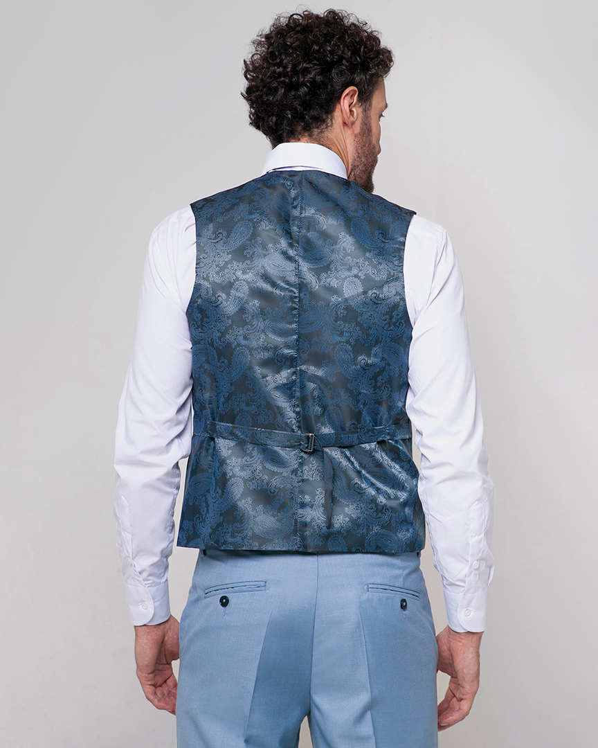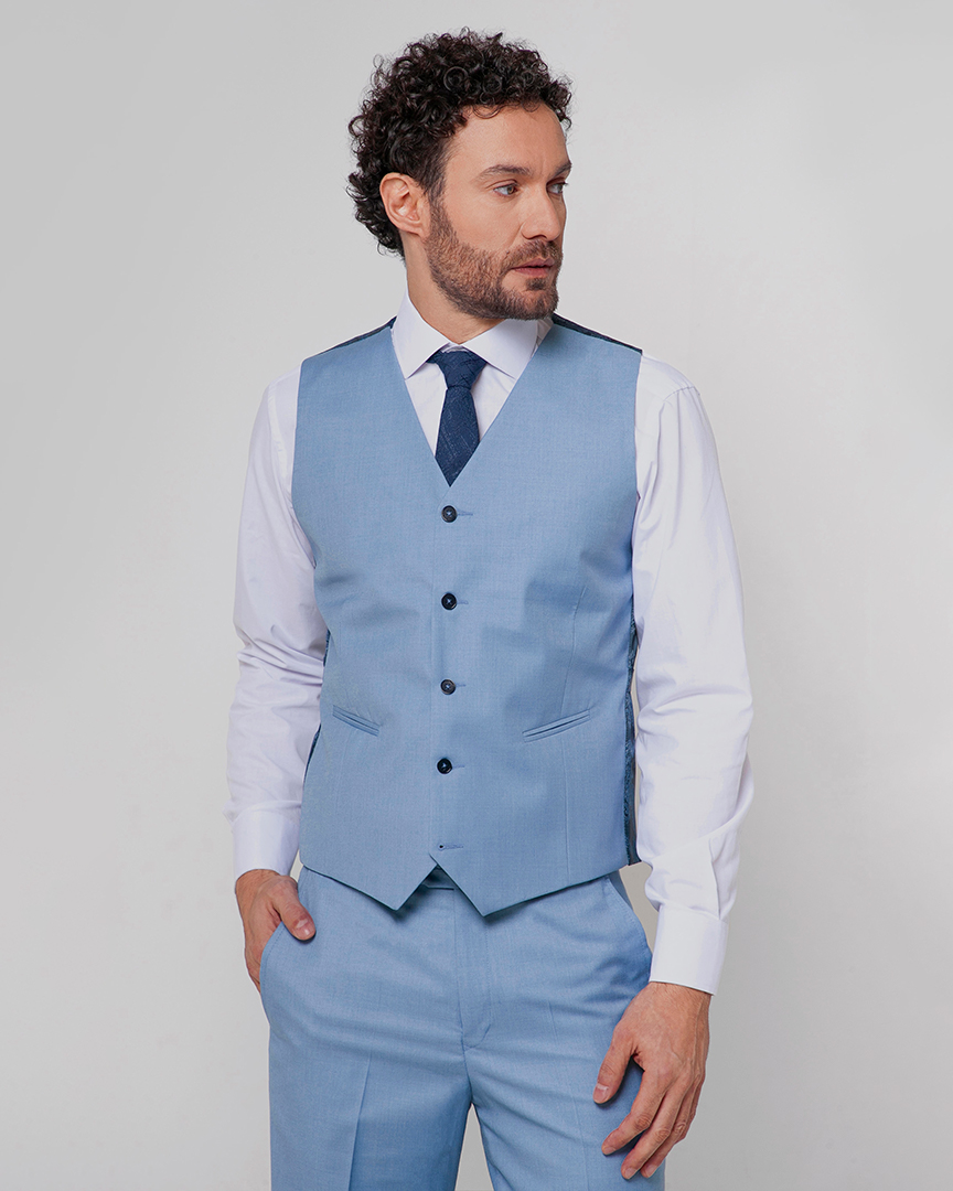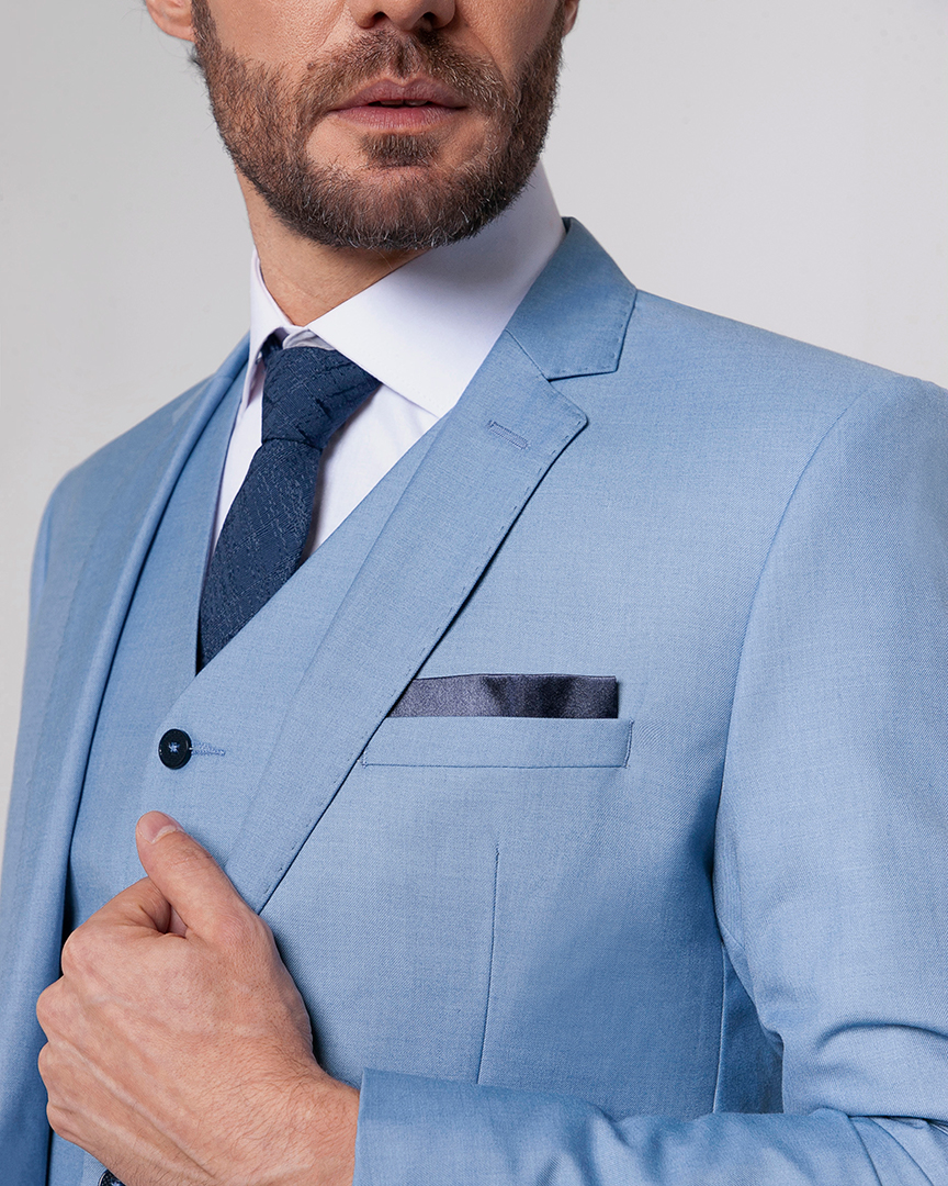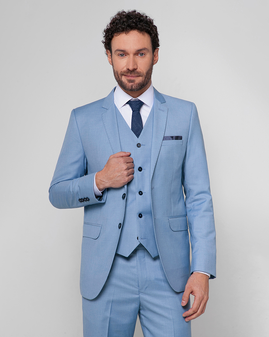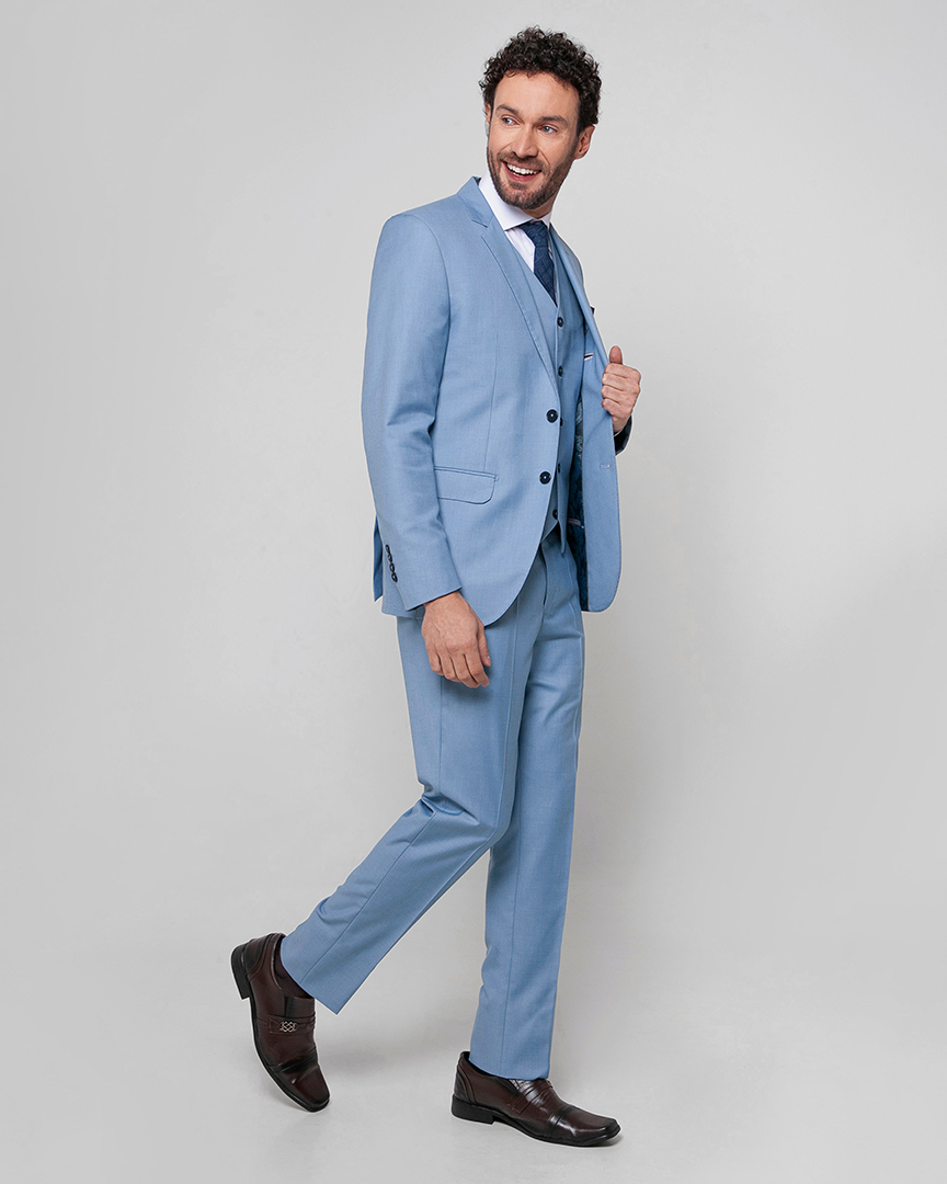 • Terno Slim Fit Poliviscose Paris Azul Sky é composto por: Paletó, calça e colete