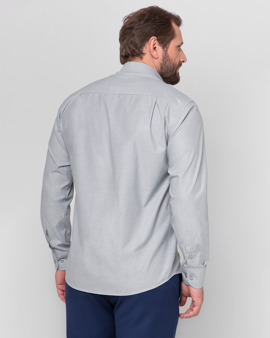 Camisa Social Cinza Azulado Manga Longa é confeccionada em tricoline fil a fil, tecido que possui uma mescla de fios, composto por um fio de cor predominante azul e outro fio branco, possuindo uma textura leve e resistente. A combinação de algodão com poliéster proporciona um toque suave e agradável à pele, ao mesmo tempo em que confere maior durabilidade e facilidade de cuidado. Seu colarinho bem estruturado e os punhos cuidadosamente trabalhados adicionam um toque refinado ao visual.