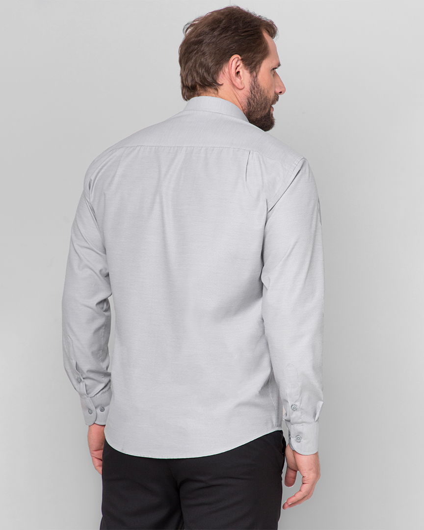 Camisa Social Cinza Manga Longa é confeccionada em tricoline fil a fil, tecido que possui uma mescla de fios, composto por um fio de cor predominante e outro fio branco, sendo conhecido pela sua textura leve e resistente. A combinação de algodão com poliéster proporciona um toque suave e agradável à pele, ao mesmo tempo, em que confere maior durabilidade e facilidade de cuidado. Seu colarinho bem estruturado e os punhos cuidadosamente trabalhados adicionam um toque refinado ao visual.